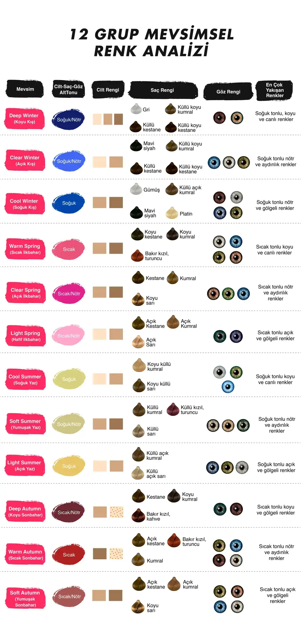 Bir de şunu unutma: Aşağı kısımlarda göreceğin tabloda da mevsimsel renk analizi cilt renginden ziyade cilt alt tonuna odaklanıyor. Cilt alt tonunun saç ve göz rengiyle birlikteliği de ortaya mevsimsel renkleri çıkarıyor.